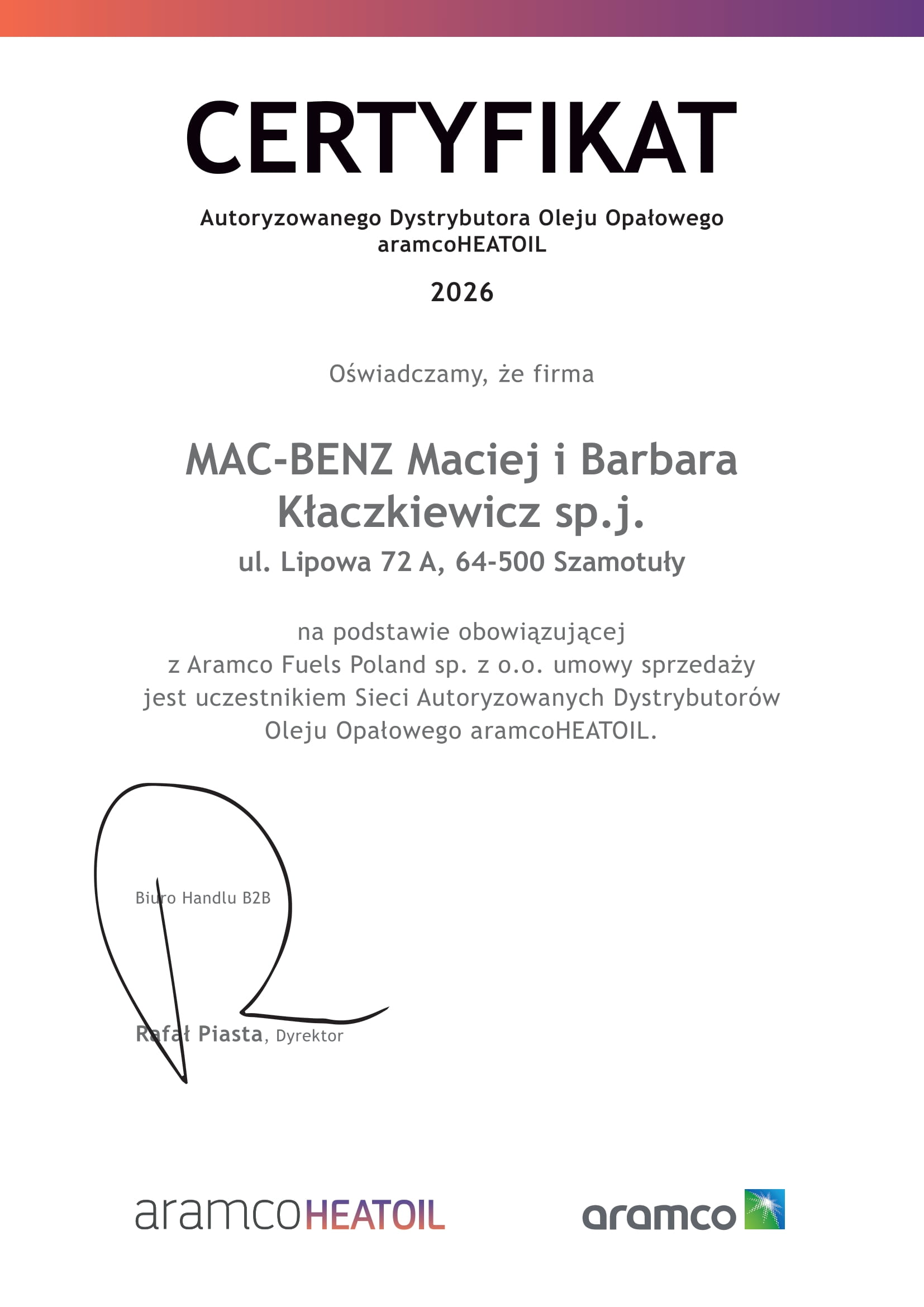 Od stycznia 2008 jesteśmy AUTORYZOWANYM DYSTRYBUTOREM OLEJU OPAŁOWEGO, produkcji ARAMCO FUELS POLAND Sp. z O.O. o nazwie aramcoHEATOIL